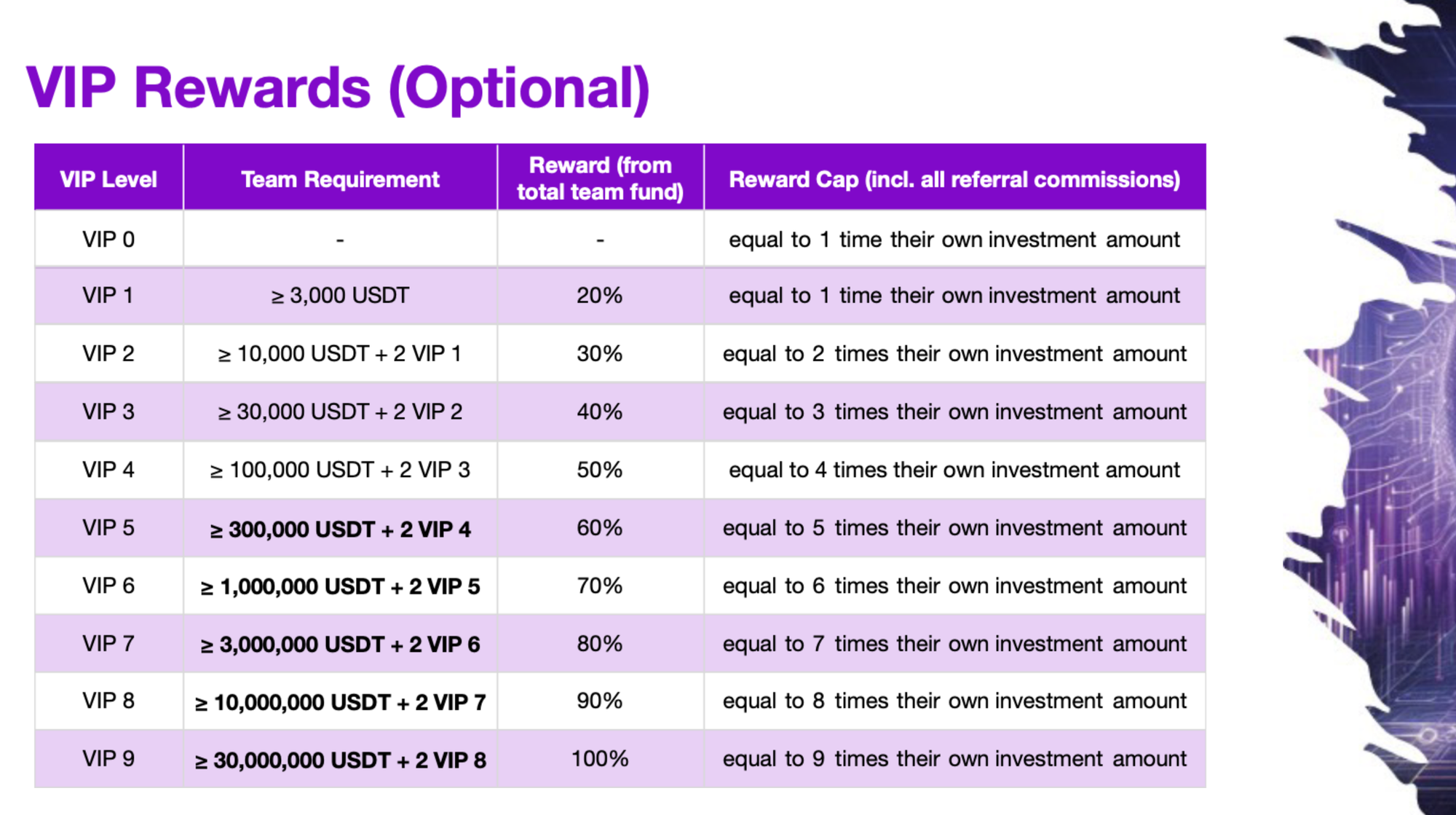 - VIP4: up to 4× your invested amount etc. see chart below